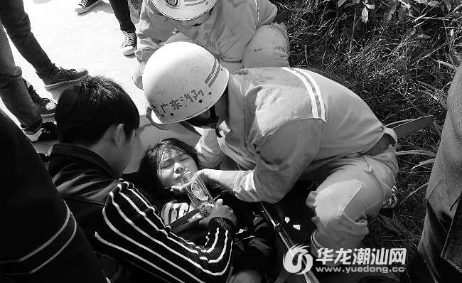 当天上午,潮阳消防中队接到119指挥中心命令后,立即出动一台抢险救援车6名指战员,迅速赶赴事故现场。经过10多分钟陡峭崎岖的山路急行,消防官兵在山顶一个陡峭的深沟中发现被困人员。经过现场侦查和询问知情人,该女子年18岁,孤身一人在东山风景区山顶游玩时不慎掉下深沟,动弹不得,出现意识模糊迹象,情况十分危急。中队长杨杰烽立即派两名战斗员利用绳索等救援工具将被困者救至安全区域,卫生员对被困者进行简单救护,其余人员利用多功能担架实施救援。十几分钟后,6名官兵终于合力将被困者救出,并小心翼翼地抬下山,交由医护人员送往附近医院接受治疗。(奖励报料人杨先生50元移动手机充值卡)