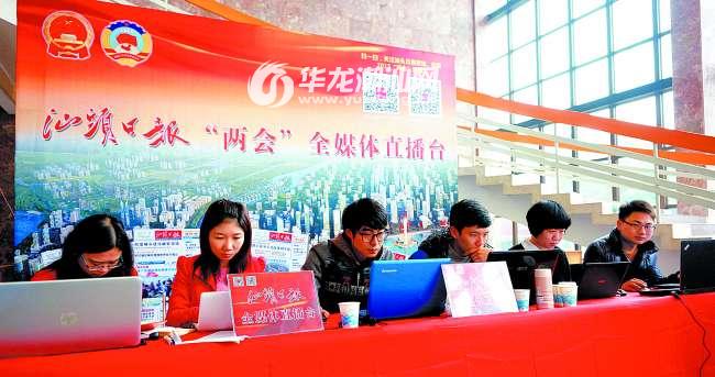 一大早,本报年轻的采编人员就进入大会主会场,在早已布置好的直播台前忙碌开来。为做好此次全媒体直播工作,本报编辑部高度重视,先后召开几次专场会议,研究部署有关直播准备工作,并做好详细的直播工作计划。由于有了去年利用官微首次成功直播市两会的经验,以及去年底本报“海丝门户——汕头港湾行”首个全媒体融合报道项目的成功实践,本次的全媒体直播市两会更有底气。两天来,本报记者多路出击,全方位聚焦,以全媒体的触角和思维方式,通过文字、声音、影像、网页等多种媒体表现手段,利用报纸、网站、电视等不同媒介形态,对市两会的新闻进行全方位传播。如,联合大华网推出汇集两会聚焦、视频报道、委员心声、提案议案、发言选粹、会场内外等栏目的市“两会”新闻专页;实时跟进两会动态,拍摄大会活动新闻视频;利用本报官方微博微信平台直播市政协十二届四次会议及市十三届人大五次会议开幕大会等。与此同时,在市人大会议开幕大会现场,设置两台最新高亮版100寸激光投影设备,滚动播放本次市两会活动的微博、视频以及本报首个全媒体融合报道项目“海丝门户——汕头港湾行”等精选视频记录。