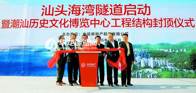 本报讯 (记者魏盼生)我市与中信集团携手推动粤东新型城镇化合作翻开新一页。昨天上午,汕头海湾隧道启动暨潮汕历史文化博览中心工程结构封顶仪式同时在中信滨海新城工地现场和海湾隧道南岸举行,这也是中国(汕头)华侨经济文化合作试验区建设的标志性工程。中信集团副董事长兼总经理王炯、市委书记陈茂辉、市长郑人豪、中信地产副董事长兼总裁宋川等共同启动吉祥杆。中国科学院院士钱七虎、周福霖,中国财政学会副会长、PPP研究院院长贾康,市领导黄俊潮、郑通声、周镇松、许瑞明出席仪式。