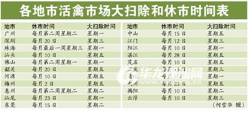 广州日报讯 (记者何雪华 通讯员粤卫信)截至目前,广东今年H7N9病例报告数39例,14个地市都有病例报告,防控专家直言“活禽市场是人感染禽流感的高危因素”。昨日,省应对H7N9联防联控办公室通报,为做好防控工作,全省各地市严格执行《广东省家禽经营管理办法》,认真落实“1110”制度,并明确出炉了各地活禽经营市场每月一休市日期和每周一大扫除时间。其中,广州每月第二周星期二进行休市,逢星期一进行大扫除。