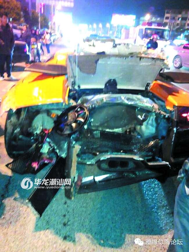 本报讯(记者 林蓁) 前天下午五点半,澄海区324国道乐唱KTV附近发生一起严重的交通事故,一辆昂贵的兰博基尼跑车在高速行驶途中,撞上停在路边三辆汽车,兰博基尼跑车车身严重受损,被网友称为“澄海史上最昂贵的车祸”。