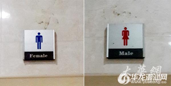 昨天下午,记者根据报料来到林百欣国际会议展览中心,在中心内一楼东侧的厕所门前看见,女厕门口挂有一个女性标识,但标识下却出现一个英文单词“male”。众所周知,“male”的中文意思是指男性。而在女厕正对面的男厕门前,也挂有一个男性标识,标注同样莫名其妙,为“female”,指的是女性。即是说,市民若从标识上理解,或从英文上理解,得到的都是两种截然不同的意思。
