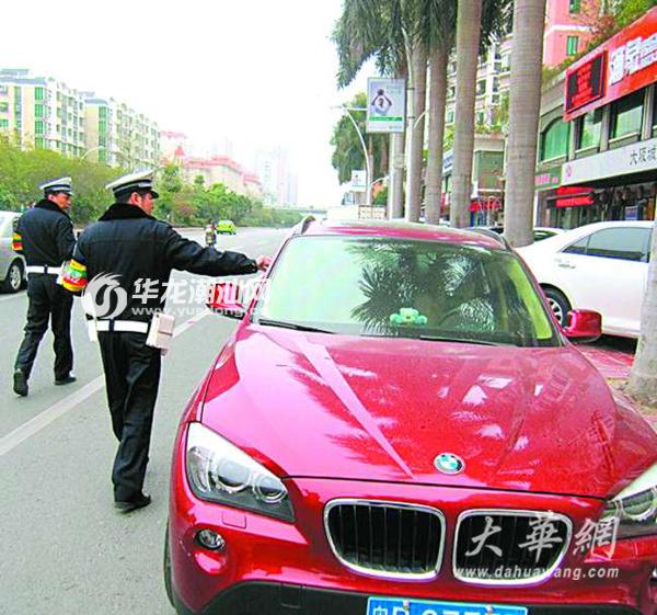 我市公安交警部门共查处道路交通违法行为9.9万宗,其中机动车乱停6845宗、违反禁令1528宗、冲红灯19213宗、酒驾10宗(其中醉驾2宗)、飙车6宗、无证驾驶311宗;查扣后三轮摩托车和报废、无牌两轮摩托车320多辆。公安交警部门还通过移动通信运营商向手机用户发送“民生快信”,提示将利用电子手段对中心城区主干道实施流动监控抓拍并依法处罚,请市民不要乱停乱放车辆。图为一辆红色宝马逆向停放被罚。
