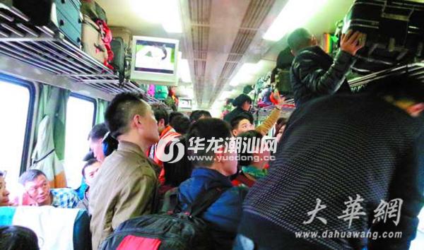下午4点52分,K800次列车缓缓驶出汕头火车站。卧铺乘客都已上车,行李架上放满了各种行李包箱(见图)。而在另一边的硬座车厢,记者远远就看到车厢门口的地方站满了人,车门处、厕所门口、盥洗室都是人和行李。据了解,当天K800次列车共有17节车厢。当天下午在汕头上车的有880人,之后在潮州、揭阳、梅州三站分别上车200多人,晚上8点多列车到达梅州之后车厢内有将近1600名乘客。从2月4日春运开始,K800次列车每天平均超员率在50%以上,按每节硬座车厢定员118人计算,这意味着每节硬座车厢有60多人是站着的,再加上行李和小孩,拥挤程度可以想像。