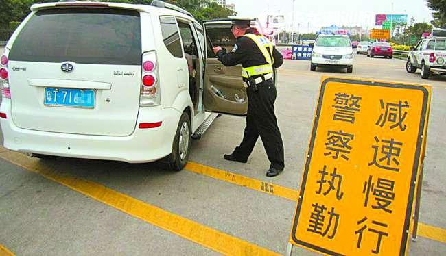 下午4时45分,一辆号牌为粤D/ZD8××的白色长安福特牌小汽车在经过收费站时,被执勤交警发现没有悬挂后车牌。“后车牌丢了,补做刚领到手,放在车里还没装上。”开车的中年妇女辩称,但此说法未能得到证实,民警依法对其作出了处罚。